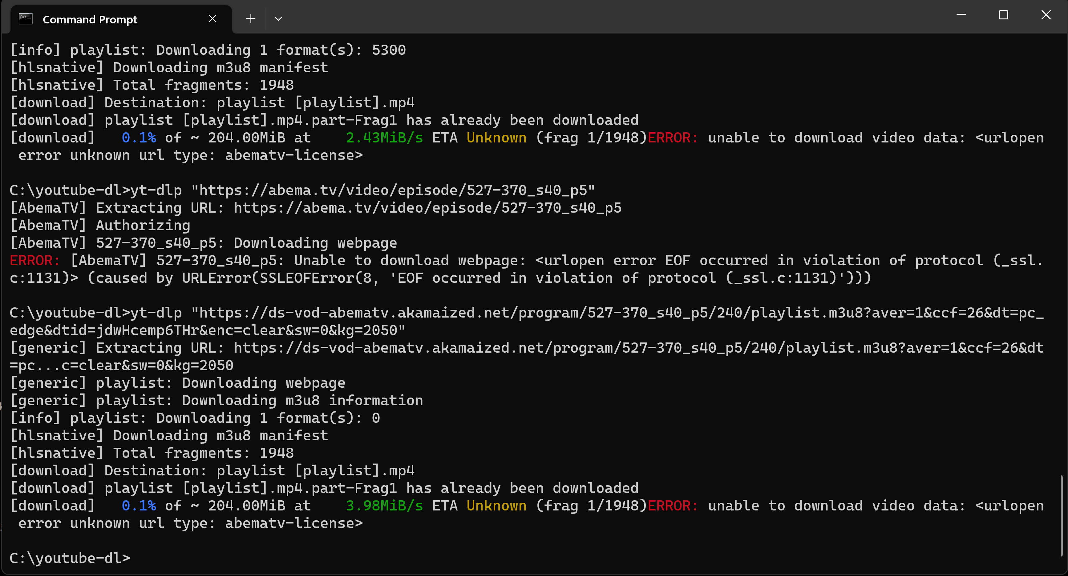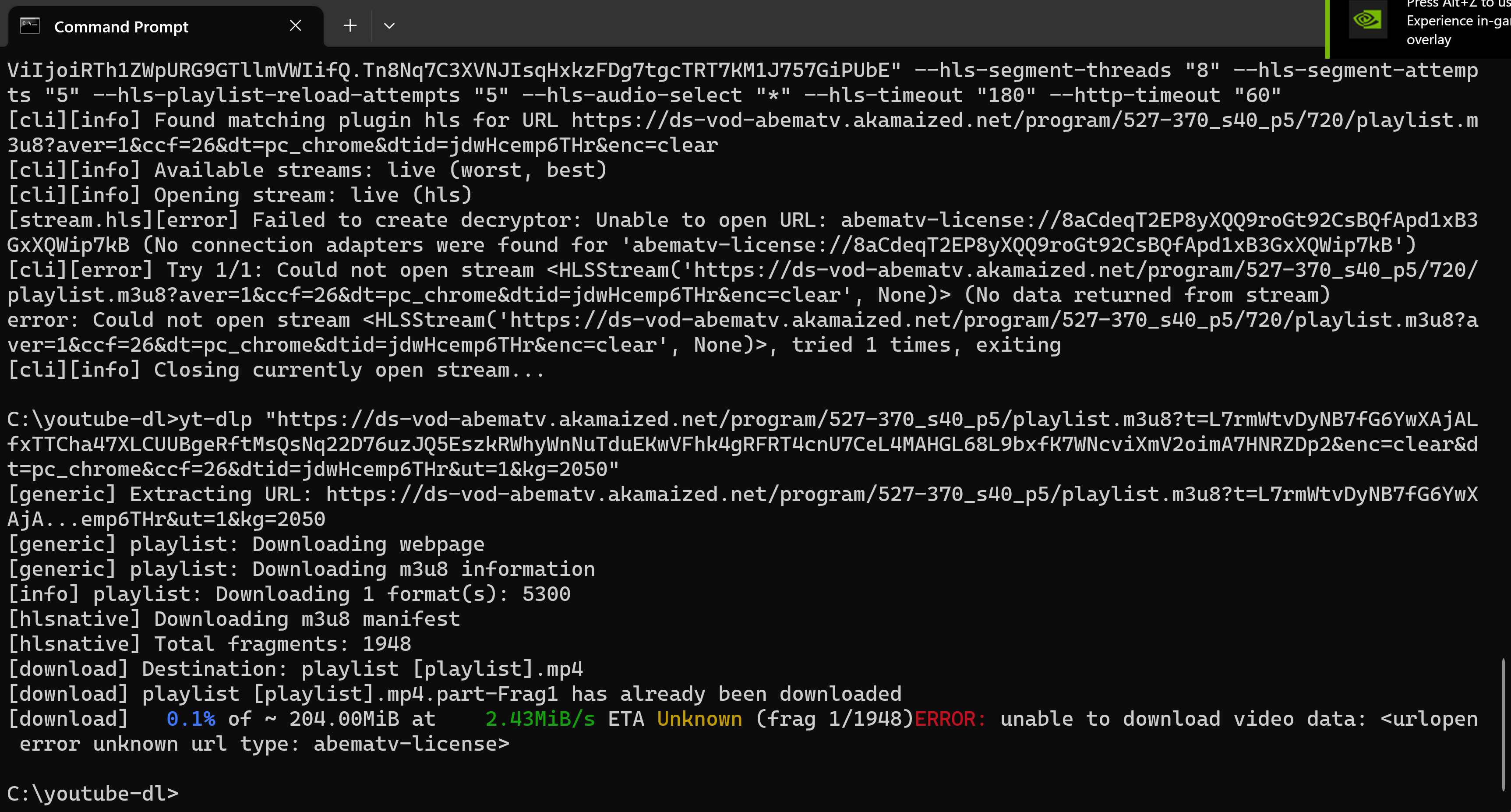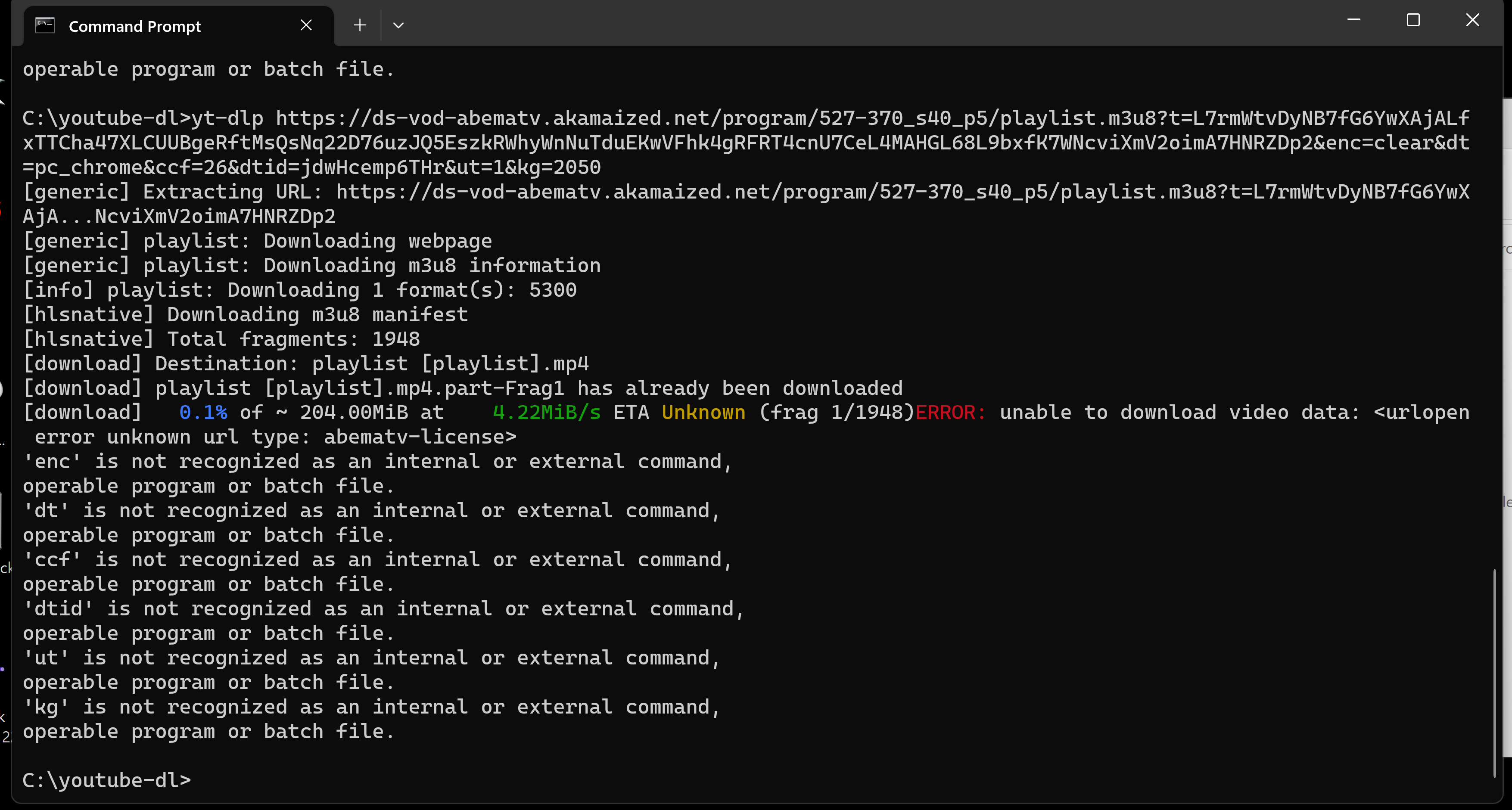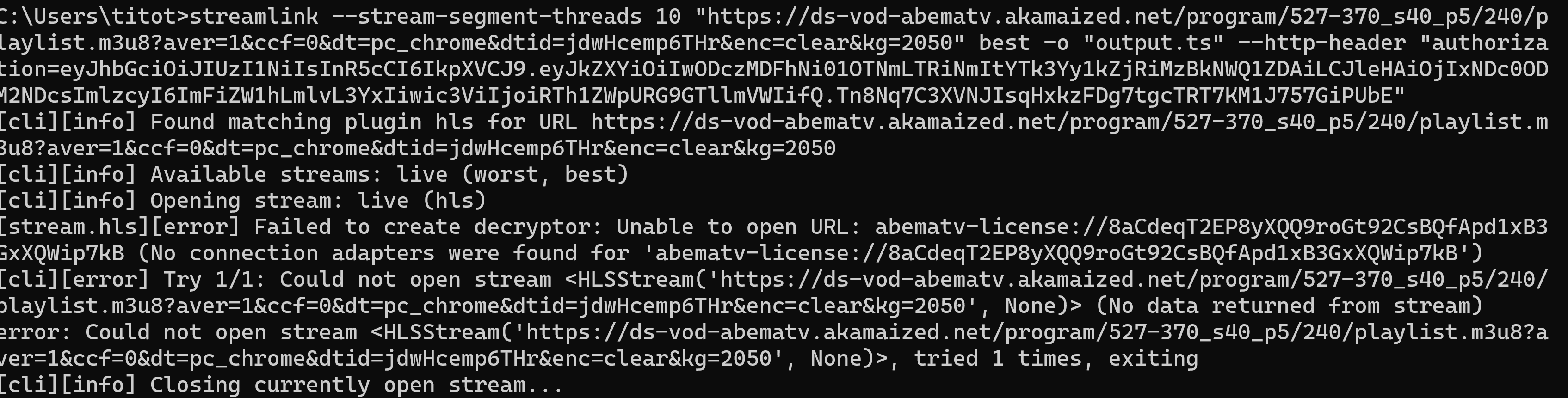 Code:yt-dlp "http://ds-vod-abematv.akamaized.net/program/527-370_s40_p5/playlist.m3u8?t=L7rmWtvDyNB7fG6YwXAjALfxTTCha47XLCUUBgeRftMsQsNq22D76uzJQ5EszkRWhyWnTduEKwVFhk4gRFRT4cnU7CeL4MAHGL68L9bxfk7WNcviXmV2oimA7HNRZDp2&enc=clear&dt=pc_chrome&ccf=26&dtid=jdwHcemp6THr&ut=1&kg=2050"
