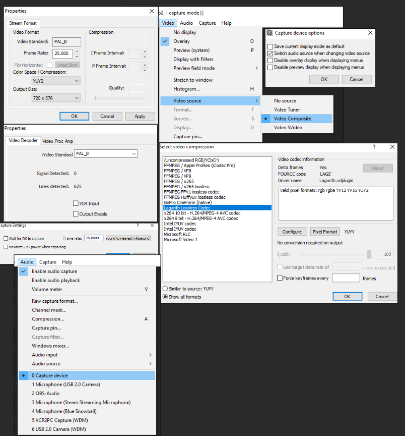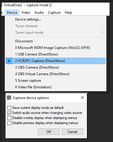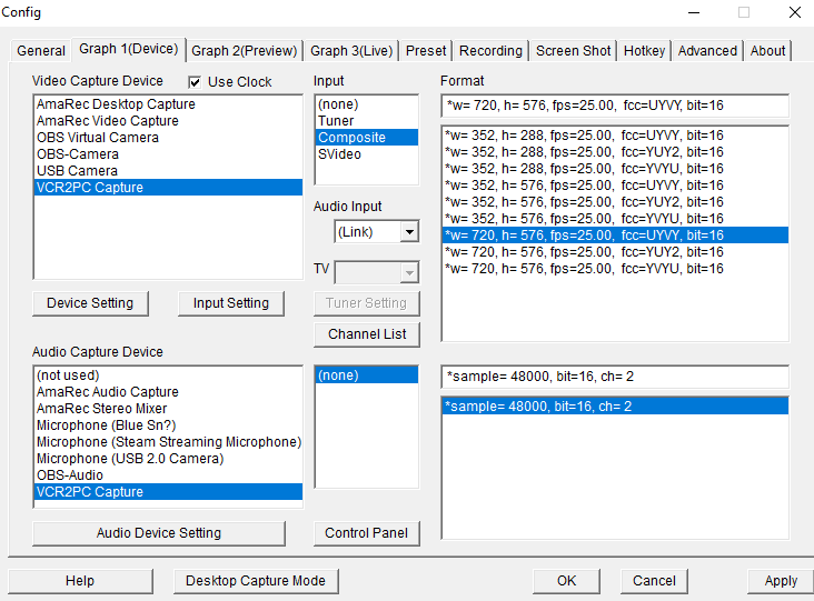 Yep tried every option. I selected the vcr2pc in both video and audio as it's the only way to see and hear the vhs playing in the pre-capture preview. In control panel the vcr2pc doesn't show up as an audio recording device though but it does work on obs.