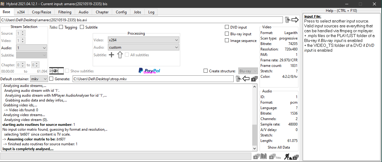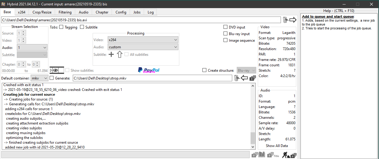 aborts withCode:"C:\Program Files\Hybrid\32bit\ffmpeg.exe" -y -loglevel fatal -noautorotate -nostdin -threads 4 -i "C:\Users\Dell\AppData\Local\Temp\encodingTempSynthSkript_2021-05-19@23_18_55_6210.avs" -an -sn -pix_fmt yuv420p -vsync 0 -f rawvideo - | "C:\Program Files\Hybrid\64bit\x264.exe" --preset veryfast --pass 2 --bitrate 7000 --profile high --level 4.1 --ref 3 --direct auto --b-adapt 0 --sync-lookahead 6 --qcomp 0.50 --rc-lookahead 40 --qpmax 51 --partitions i4x4,p8x8,b8x8 --no-fast-pskip --subme 5 --aq-mode 0 --vbv-maxrate 62500 --vbv-bufsize 78125 --sar 1:1 --non-deterministic --range tv --colormatrix bt470bg --stats "C:\Users\Dell\AppData\Local\Temp\st trop_2021-05-19@23_18_55_6210_05.stats" --demuxer raw --input-res 720x480 --input-csp i420 --input-range tv --input-depth 8 --fps 60000/1001 --output-depth 8 --output "C:\Users\Dell\AppData\Local\Temp\2021-05-19@23_18_55_6210_06.264" -