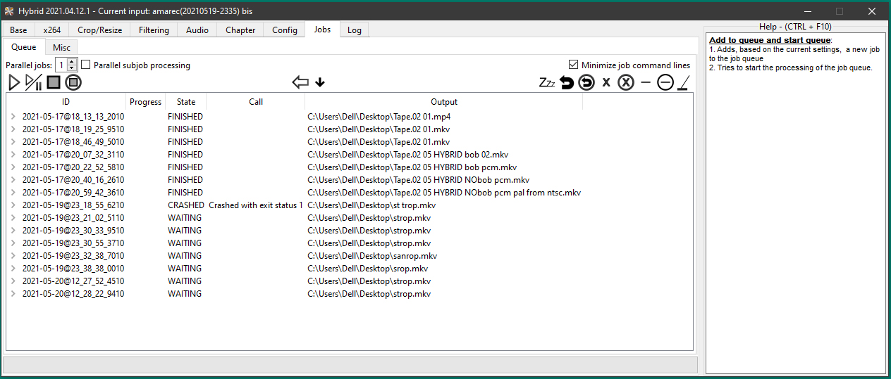 Seems like the temp files exist when the job processing is started and then Hybrid starts the 2nd pass before the first pass since it assumes that's what should happen.Code:(2021-05-20@17_21_04_7510_06): ffmpeg_32 -y -loglevel fatal -noautorotate -nostdin -threads 4 -i "C:\Users\Dell\AppData\Local\Temp\encodingTempSynthSkript_2021-05-20@17_21_04_7510.avs" -an -sn -pix_fmt yuv420p -vsync 0 -f rawvideo - | x264 --preset veryfast --pass 2 --bitrate 7000 --profile high --level 4.1 --ref 3 --direct auto --b-adapt 0 --sync-lookahead 6 --qcomp 0.50 --rc-lookahead 40 --qpmax 51 --partitions i4x4,p8x8,b8x8 --no-fast-pskip --subme 5 --aq-mode 0 --vbv-maxrate 62500 --vbv-bufsize 78125 --sar 10:11 --non-deterministic --range tv --colormatrix bt470bg --stats "C:\Users\Dell\AppData\Local\Temp\strop_2021-05-20@17_21_04_7510_05.stats" --demuxer raw --input-res 720x436 --input-csp i420 --input-range tv --input-depth 8 --fps 60000/1001 --output-depth 8 --output "C:\Users\Dell\AppData\Local\Temp\2021-05-20@17_21_04_7510_06.264" -