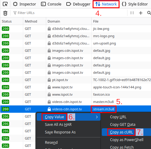Go to the Network tab (4.), reload the page, find the appropriate .m3u8 entry, typically named stream.m3u8 or something similar (5.), right-click, Copy Value (6.) > Copy as cURL (7.).