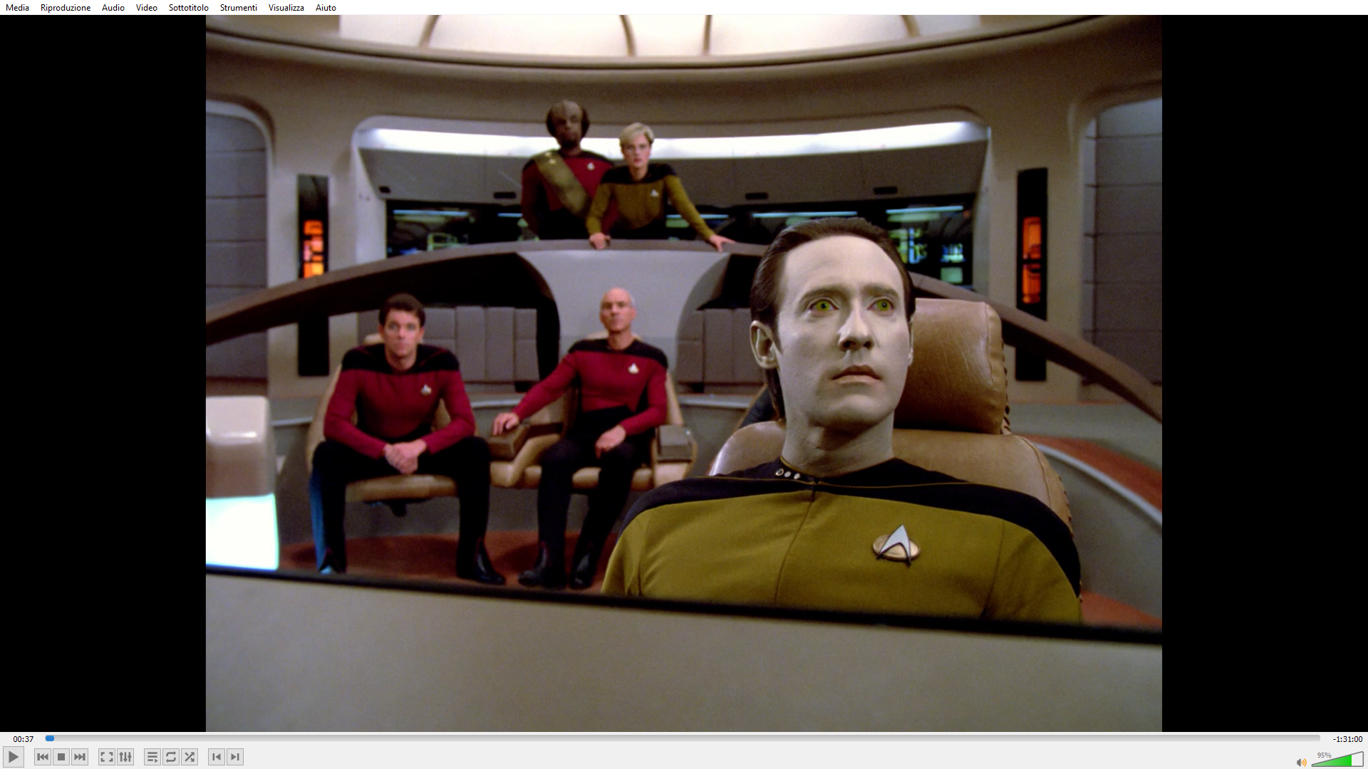 A good section of the clip for testing is from about 32 to 38 seconds into the clip. Try different fhqdn3d settings and crf values on that section. Watch the detail the headrest behind Data's head, and the noise in the shadow there. Also watch the small low contrast details on Data's head when it moves (wrinkles, rough skin, etc.). If you filter too much they will disappear when his head is moving, then reappear when it stops. Or just disappear altogether. You want to strike a balance between loss of those real details and reducing noise.Code:ffmpeg -y -i original.mkv -pix_fmt yuv420p10le -vf crop=1440:1080:240:0,hqdn3d=2.0:3.0:6.0:4.5 -c:v libx265 -preset medium -profile main10 -crf 25 output.mkv