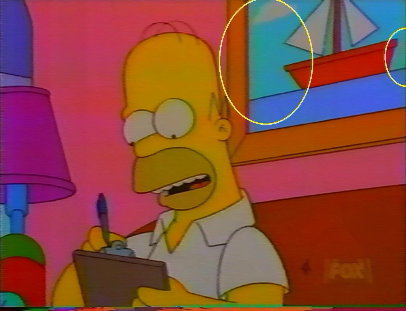 The highlighted portions in image #2 are just VHS. The low chroma bandwidth causes these incorrect colors. In the original it was a hard boundary; quick transition. On VHS it's a soft boundary; slow, smeared transition.My YouTube channel with little clips: vhs-decode, comparing TBC, etc. -