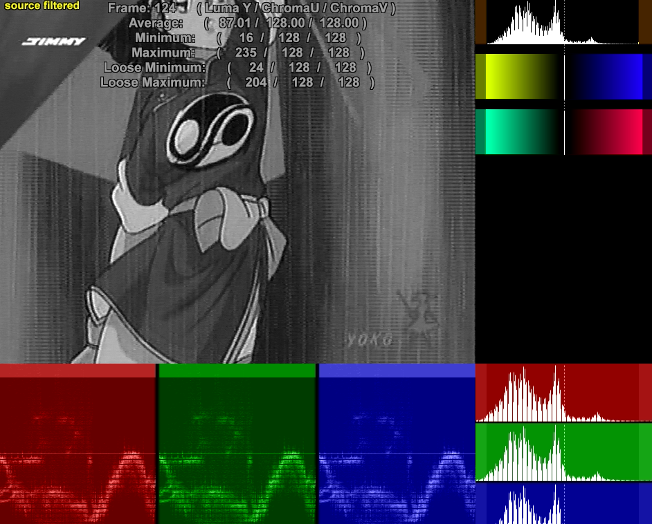 When we grayscale the image (forcing R=B=G or Cb=Cr=128) and inspect the RGB Histogram we see the gaps in the waveform and in the Histogram (RGB format at the bottom)