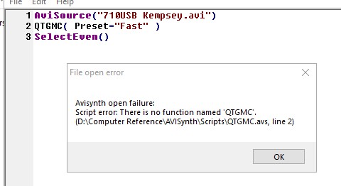 I get varying error messages from VDub, as follows:Code:AviSource("710USB Kempsey.avi") QTGMC(Preset="Fast") SelectEven()