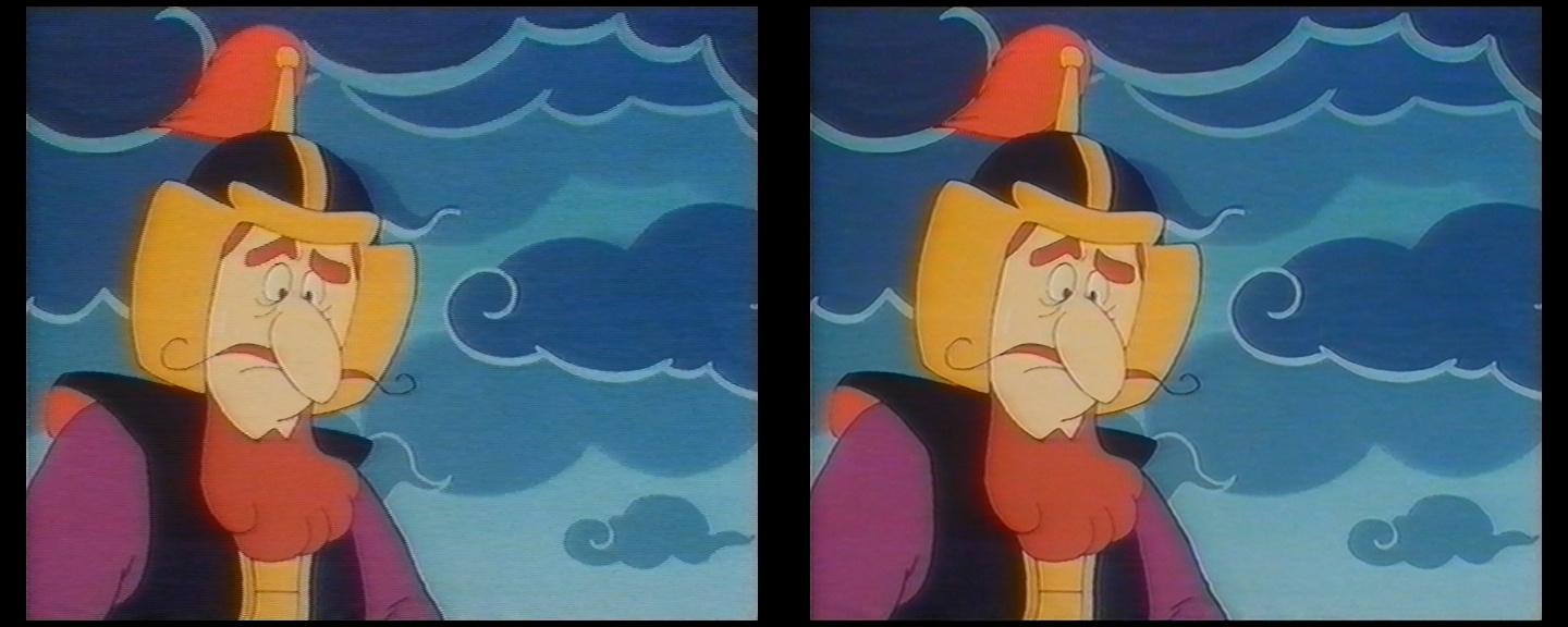 I'm playing around with TFM if there's something funky with the video, and the Levels/ChromaShift. If there is something you think that can benefit most if not all cartoon - let me know and I'll check it out, see if I can add it to be applied to most of the videos.Code:AviSource("Z:\Videos\VHS\Children\Loseless\Roga.avi") Robocrop() TFM() MergeChroma(Levels(20, 1.0, 210, 16, 235, coring=false), last) ChromaShiftSP(y=2, x=-3) Prefetch(3)