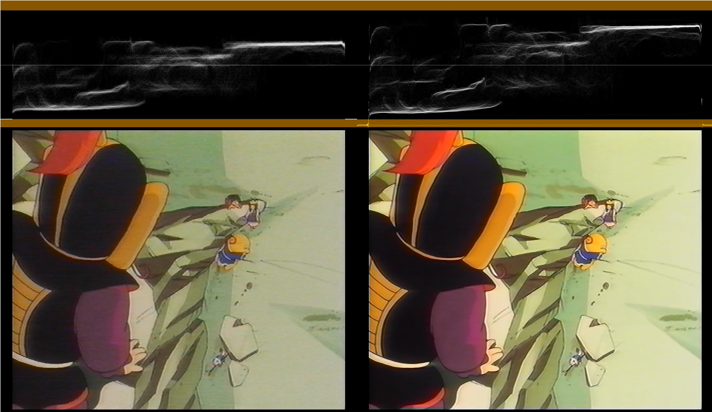 - Something here confuses me. This is a cartoon, and as far as I know cartoons should be IVTCed, not de-interlaced. Why are you de-interlacing this one? and how did you came to the conclusion InputType2 should be used ("badly deinterlaced material")? It's indeed making the picture looks better, but introduce blended fields on other sections of the same video (attached).