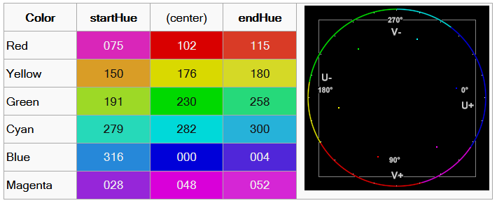 The colored boxes represent the UV vector map, the same as the maskhs diagram above, except the colors are shown within the graph rather than just a circle around the edges. U increases horizontally from left to right. V increases vertically from top to bottom. Saturation increases from the center to the edges. The mask generated from the indicated values is the black box/circle/wedge. That is, the mask was used to overlay black over the full color map.