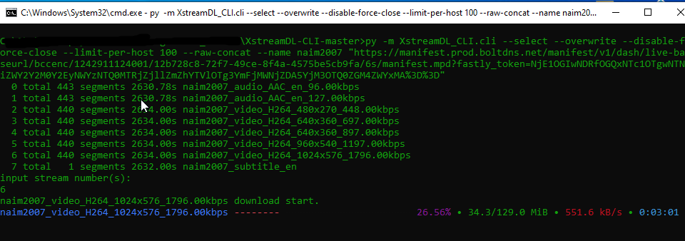 Code:py -m XstreamDL_CLI.cli --select --overwrite --disable-force-close --limit-per-host 100 --raw-concat --name naim2007 "https://manifest.prod.boltdns.net/manifest/v1/dash/live-baseurl/bccenc/1242911124001/12b728c8-72f7-49ce-8f4a-4575be5cb9fa/6s/manifest.mpd?fastly_token=NjE1OGIwNDRfOGQxNTc1OTgwNTNiZWY2Y2M0Y2EyNWYzNTQ0MTRjZjllZmZhYTVlOTg3YmFjMWNjZDA5YjM3OTQ0ZGM4ZWYxMA%3D%3D"
