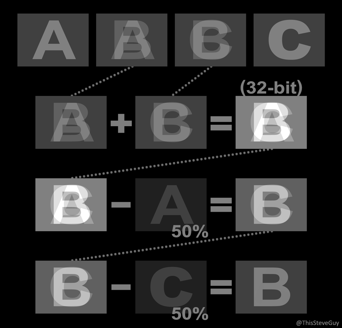 In After Effects, what I'll do is add the two blended frames together, making sure to be in 32 bit mode so that there's no clipping. Then I'll subtract both of the surrounding frames (A and C in the previous picture), while setting both of their opacities to 50%. This gives me the missing frame (B), which I can then reinsert into the footage.
