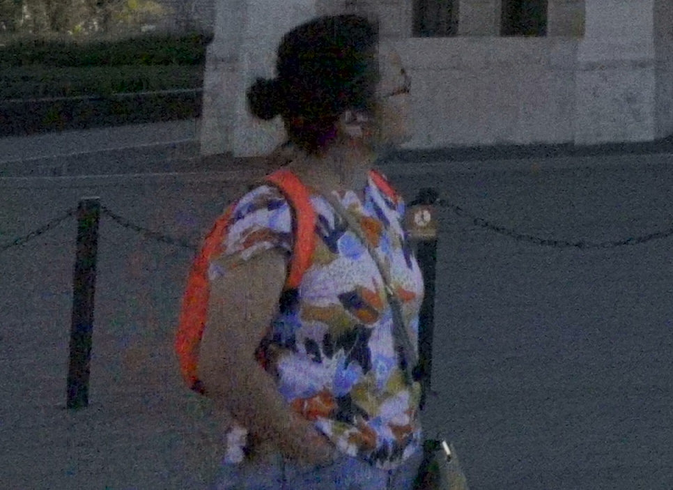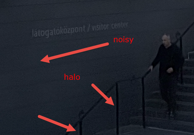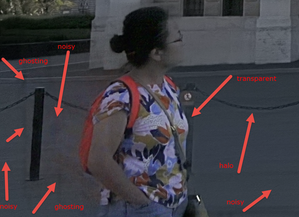 Look at the ghosting. The black pole in front of the lady is partially transparent. There are overharpened artifacts, noise enhancement on the road, splotchy grain. The uneven-ness of denoising makes it look bad on some frames - the "splotchy" patterns of partially clean, some large noise, some small, and then sharpened. In real life you don't see patches of smooth and patches of noise on the same road at the same time. Does that look "realistic" to you when you were there? Uniform noise/grain, or smooth but less detail would be more preferable to splotchy pattern . The background wall has sharpened noise artifacts - they are not real details - and you're not supposed to see clear details on objects farther away in real life, unless you see even more clear details in those objects which are closer in proximity, such as the road more clearly - and that contributes to the unnatural look - it looks "wrong". There should be depth aware sharpening, BG sharpen less than the FG, because that's how vision works in real life. Also notice the white halo around the chain link - clear signs of oversharpening. Again, I'm not saying don't sharpen, I'm saying just don't sharpen so much, because it looks terrible, is enhancing noise and causing problems