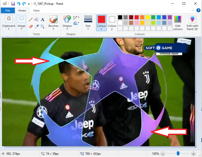 Inside the upper red arrow, the arrow header’s coordinates inside MS-Paint is: (191, 91); and inside the lower red arrow, the arrow header’s coordinates in MS-Paint is: (592, 374).