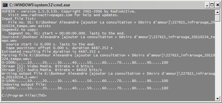 If I remember correctly, asfbin was the tool used by an all-in-one TV replay recording software I was using at the time, called TVO (now defunct), to process (“index”) WMV files after download (below are two screenshots I took on 2011/08/19 — that's almost archeology at this point !), and the resulting files exhibited the kind of issues I mentioned above, with common media players in their contemporary versions. For instance I noted in the name of one such file processed by TVO (running ffmpeg then asfbin under-the-hood) : “after TVO processing, stuttering sound in VLC, desynchronized in MPC”, problems that didn't affect files processed with Windows Media Stream Editor. If I play that same file now with VLC Media Player 3.0.16, I don't hear any audio stuttering, but about 1s is missing at the beginning with the picture appearing garbled for about 5s (if I go back to 00:00 with the left arrow key then it plays normally, i.e. not garbled, but a small bit is still missing) ; if I play it in MPC-HC 1.7.8.162 (which is not exactly up-to-date), there's a slight delay (video slightly lagging behind audio), but the same happens with the file processed with WMSE, and the beginning is fine with both files. So I'm not sure if such defects are caused by an improper processing or by intrinsic playback issues with the media player. I have yet to test with a recent version of asfbin.