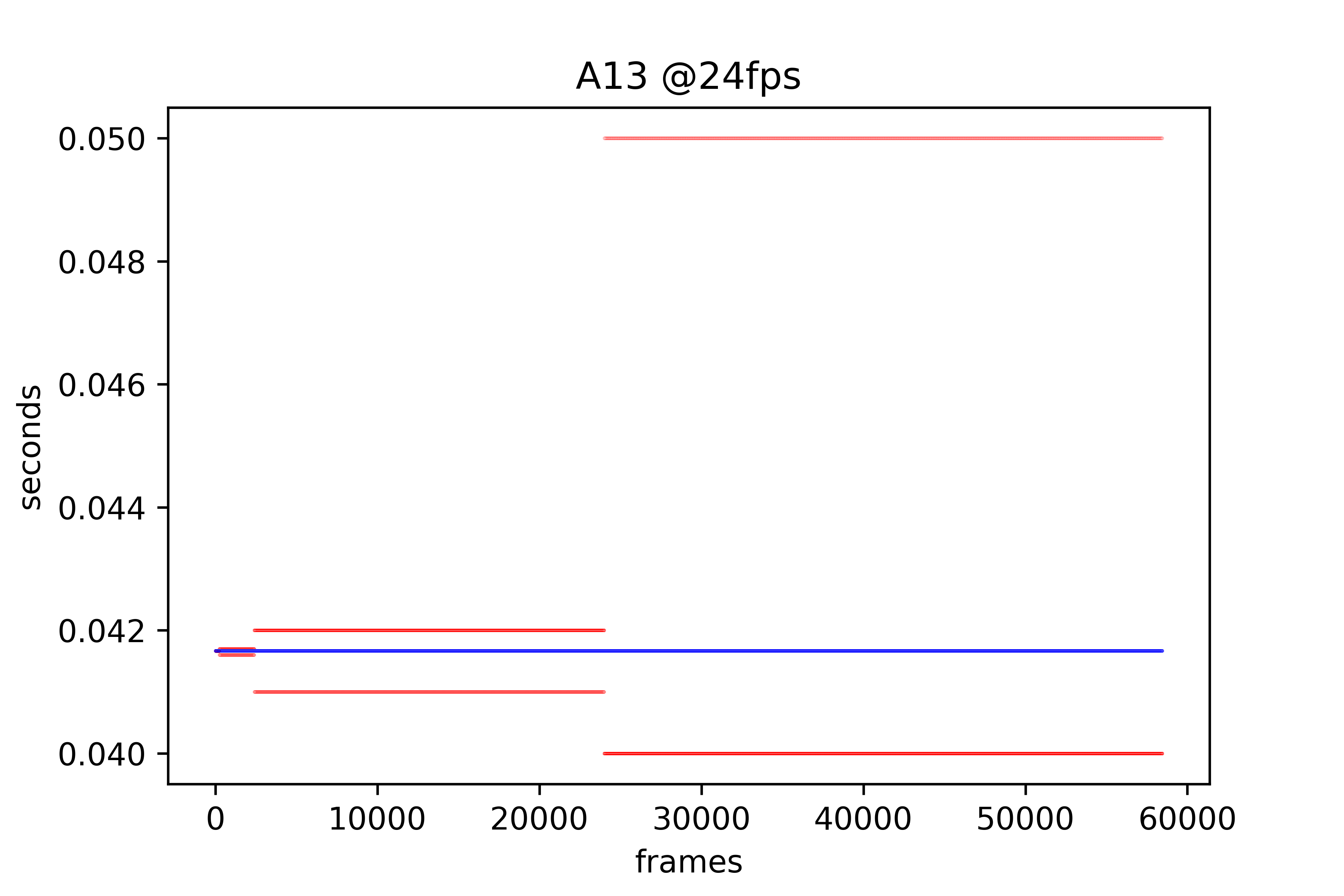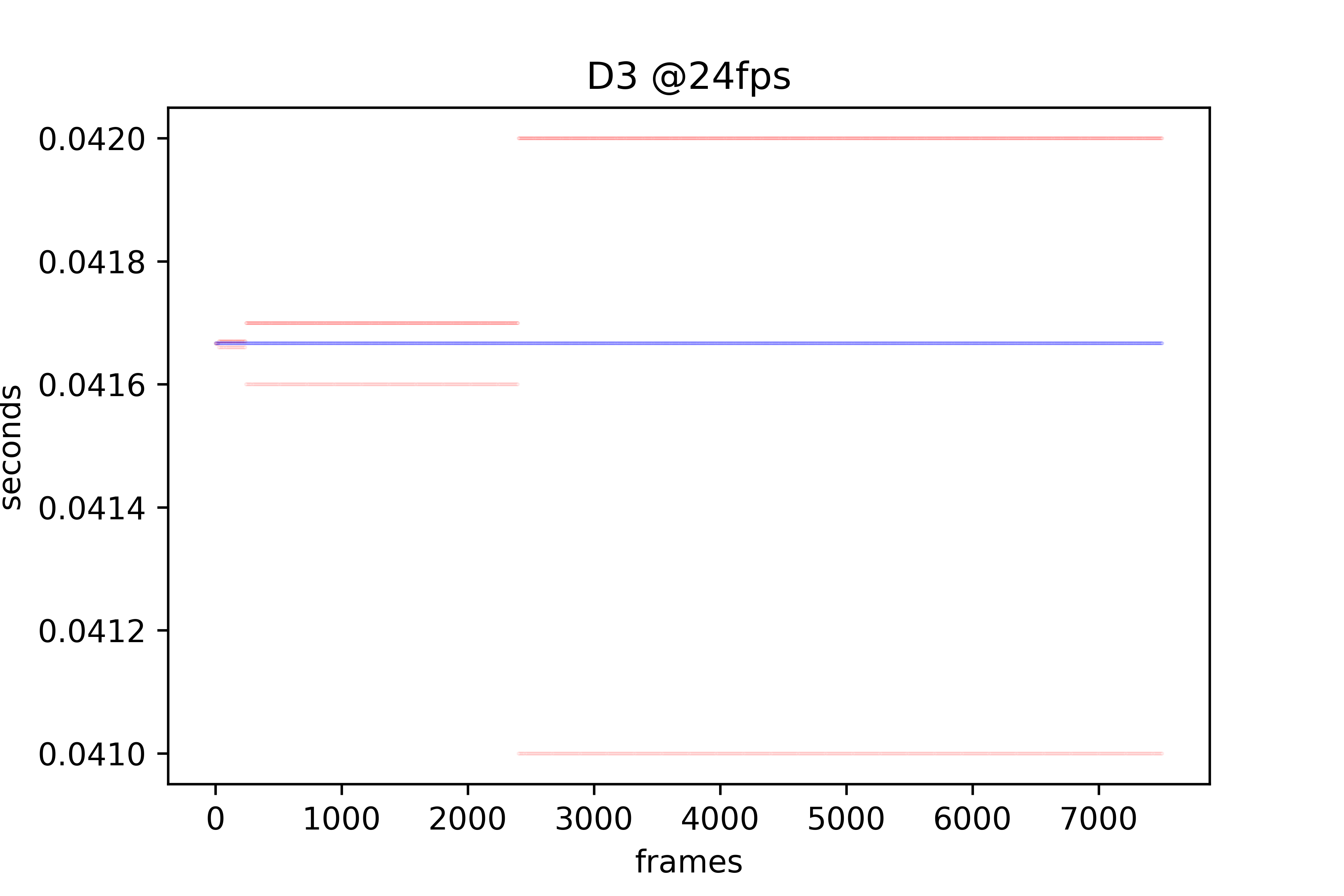 The situation is not only happening with 23.98 fps; if you see the plots, it also happens with 24fps. Additionally, even with the most precise framerate, doing 1/frame rate will always yield a constant value, but the actual duration of frames is not constant. This is what my question is about.