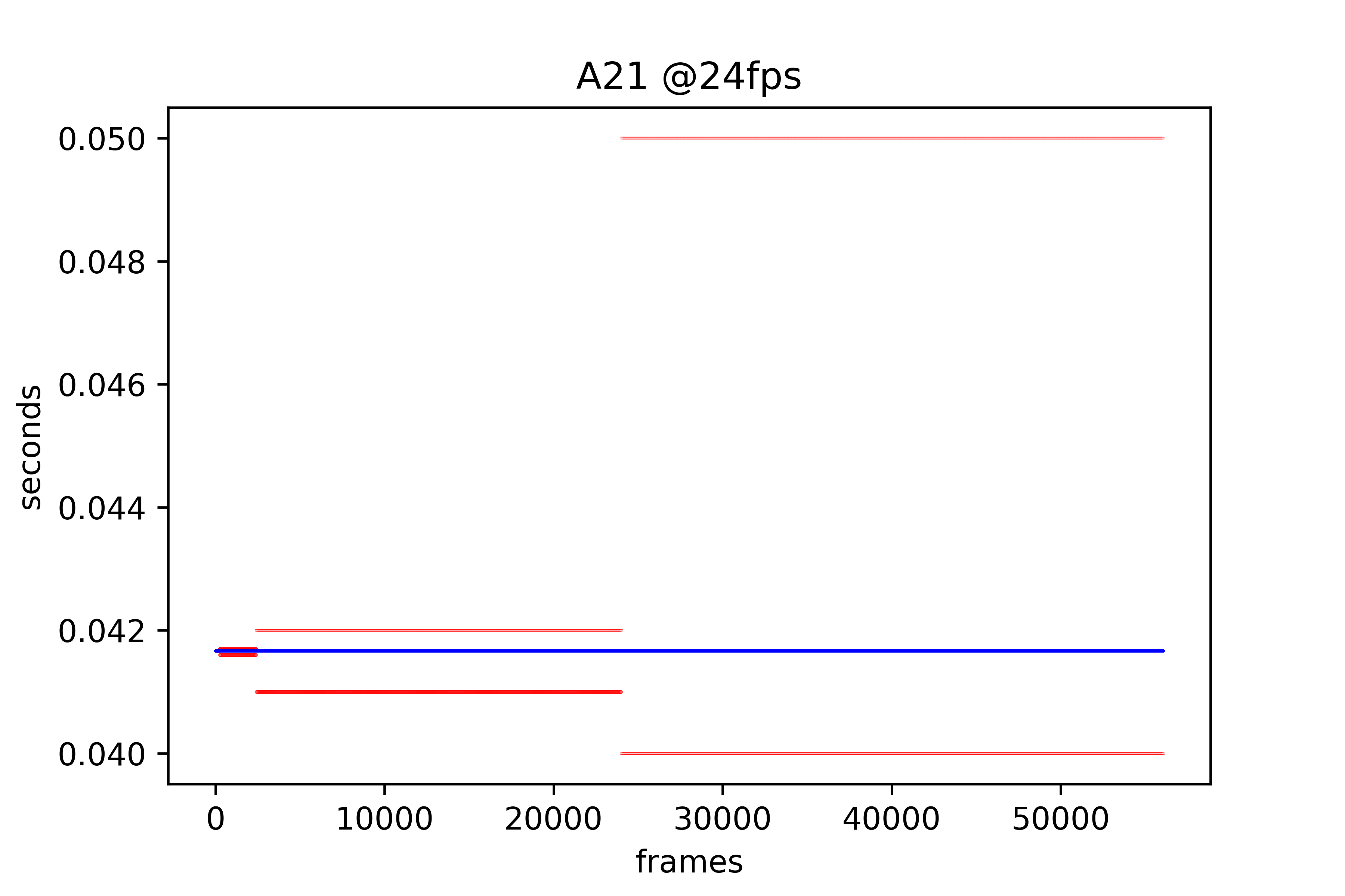 As you can see here, there is a pattern in all videos. The duration of frames always oscillates, but with a different amplitude in different ranges. In the first 300 frames (more or less), the oscillations are very close to the value of 1/24 = 0.041666666666 seconds, but then start to oscillate further away from it. Then, in all videos except for the shortest one, the oscillations get even bigger at around 24000 frames. In the shortest one, this happens at around 2400 frames, but the values are a bit smaller. When I get the average of all these durations in red, the value is always the same as in the blue line, which I calculated with 1/24 = 0.041666666666. Maybe this also happens in the longest videos too, but it's not easy to see in the plot.