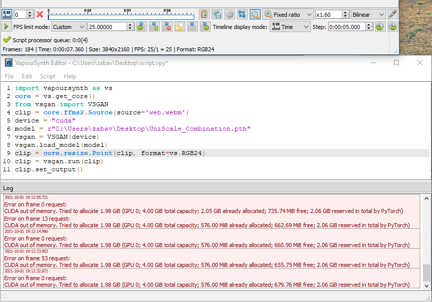 Cu SelurCode:# split video into 4 tiles tile1 = core.std.CropRel(clip=clip, left=0, right = clip.width%2*1, top=0, bottom=clip.height%2*1) tile2 = core.std.CropRel(clip=clip, left=clip.width%2*1, right = 0, top=0, bottom=clip.height%2*1) tile3 = core.std.CropRel(clip=clip, left=0, right = clip.width%2*1, top=clip.height%2*1, bottom=0) tile4 = core.std.CropRel(clip=clip, left=clip.width%2*1, right = 0, top=clip.height%2*1, bottom=0) # load VSGAN from vsgan import VSGAN vsgan = VSGAN("cuda") vsgan.load_model(model) # apply VSGAN tile1 = vsgan.run(clip=tile1) tile2 = vsgan.run(clip=tile2) tile3 = vsgan.run(clip=tile3) tile4 = vsgan.run(clip=tile4) # join tiles clip = core.std.StackVertical([core.std.StackHorizontal([tile1, tile2]),core.std.StackHorizontal([tile3, tile4])])users currently on my ignore list: deadrats, Stears555, marcorocchini -