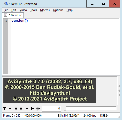 Or you can use Notepad to create the script. Start Notepad. Type Version(). Save the script with File -> Save As. Be sure to name it with .AVS as the extension. Ie, Version.AVS, not Notepad's default extension of .TXT. Start VirtualDub2. Select File -> Open Video File. Navigate to where you saved version.avs and open it: