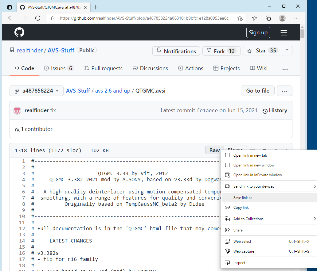 For future reference, saving qtgmc.avsi from github is a little tricky. From the web page pictured right click on the Raw button and select Save As (or Save Link As, depending on what browser you're using) from the context menu.