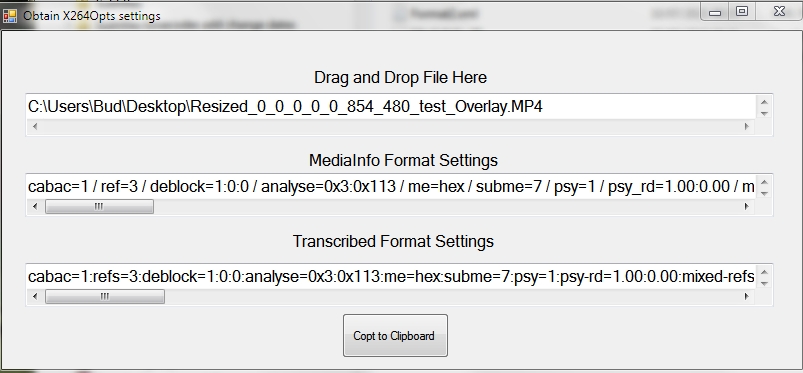 Only a few people may need to convert MediaInfo's Format settings to x264opts under FFMpeg but since I regularly use to ensure compatabilty, I posted a utility that does that for anyone that needs. It converts the Format string in MediaInfo, changing the ' / ' to ':' and renames those attributes that are different (E.G. Ref to Refs).
