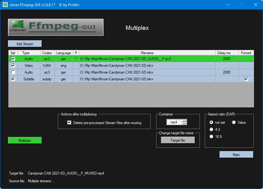 When done, click Multiplex, all necessary streams are already loaded (the new created audio stream is shown in green color), deselect the old audio stream, select mp4 as container (if it is not already selected), click Multiplex.