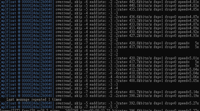 2. iirc this happens if ffmpeg is estimating the duration from bitrate (since the input lags proper headers, or has damaged headers) and durind the audio decoding often read too far ahead, this can but might not cause problems.