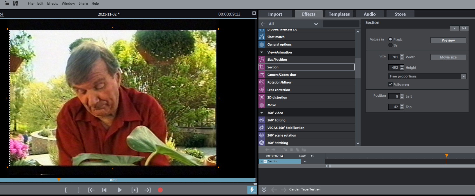 Code:AviSource("Garden Tape Test.avi").AssumeTFF() MergeChroma(Crop(0,2,0,0).AddBorders(0,0,0,2)) #shift chroma up by 2 lines #my standard call for QTGMC for these sources, just ignore the mass of parameters (many are at default) QTGMC(tr0=2,tr1=2,tr2=1, rep0=1,rep1=0,rep2=4, edimode="NNEDI3", Preset="slower", ShowSettings=false, EdiThreads=4, \ Border=false, Blocksize=16, search=4, SearchParam=2, dct=5, ThSAD1=640, ThSAD2=256, ThSCD1=300, ThSCD2=110, \ SourceMatch=3, matchpreset="slow", Lossless=2, Sharpness=0.1, Sbb=0, \ NoiseProcess=2, GrainRestore=0.0, NoiseRestore=0.4, NoisePreset="slow", shownoise=false, \ StabilizeNoise=false, NoiseTR=0, NoiseDeint="bob" ) Crop(8,44,-8,-44) #crop to a 704 width and crop the letterboxing #actual active image is 704x488; #so with a PAR of 12/11 for analog video that means the aspect ratio is 1.574:1 (very close to 14:9 indeed) #the math for resizing: 576 * 1.574 / (16/11) = 623.3 = 624 Spline16Resize(624,576) AddBorders(40,0,40,0) #add Pillarbox borders until 704 is reached SeparateFields().SelectEvery(4,0,3).Weave() #re-interlace #output is 704x576i (TFF), 16:9, YUY2, for ProCoder at 6200 kbps 2-pass