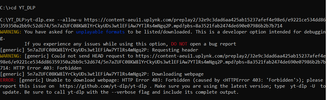 yt-dlp --allow-u https://content-aeui1.uplynk.com/preplay2/32e9c3dad6aa425ab15237afef4e98e6/e9221ce534dd86359350a2bb9c52d674/5n7aZUFC08KW8lYrCkyUDs3wtlEFiAw7YTlRs4mNgq2P.mpd?pbs=8a3521fab2474de690e07986b2b7b714