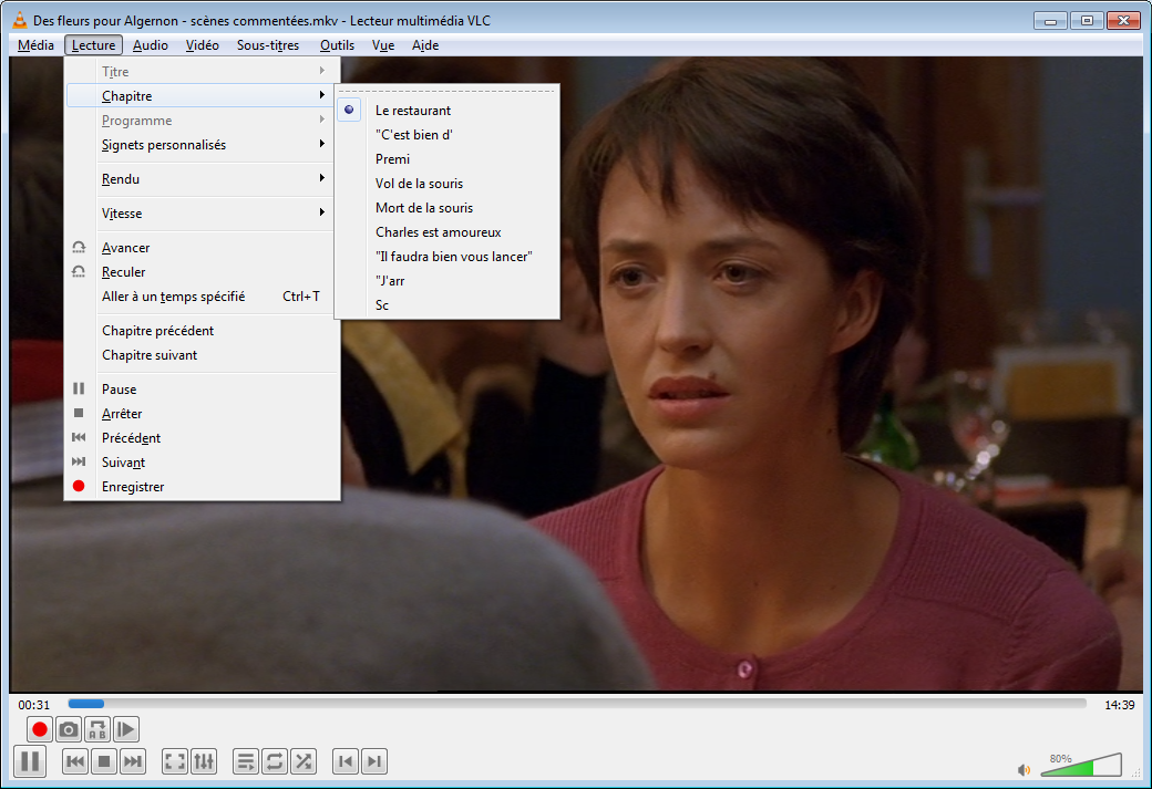 In VLC Media Player, the titles get truncated at the first accentuated character :Code:General Unique ID : 138163081340327188520959396353765409417 (0x67F13DD6A0C9A1B798D141AB189E0289) Complete name : M:\Des fleurs pour Algernon - scènes commentées.mkv Format : Matroska Format version : Version 4 File size : 256 MiB Duration : 14 min 39 s Overall bit rate : 2 438 kb/s Encoded date : UTC 2021-11-03 15:59:34 Writing application : Lavf58.35.101 Writing library : Lavf58.35.101 ErrorDetectionType : Per level 1 ENCODING_PARAMS : vers ITUNSMPB : 00000000 00000840 000003C0 0000000002841C00 00000000 00000000 00000000 00000000 00000000 00000000 00000000 00000000 Video ID : 1 Format : AVC Format/Info : Advanced Video Codec Format profile : High@L4 Format settings : CABAC / 16 Ref Frames Format settings, CABAC : Yes Format settings, Reference frames : 16 frames Codec ID : V_MPEG4/ISO/AVC Duration : 14 min 39 s Width : 720 pixels Height : 576 pixels Display aspect ratio : 16:9 Frame rate mode : Constant Frame rate : 25.000 FPS Standard : PAL Color space : YUV Chroma subsampling : 4:2:0 Bit depth : 8 bits Scan type : Progressive Writing library : x264 core 158 Encoding settings : cabac=1 / ref=16 / deblock=1:0:0 / analyse=0x3:0x133 / me=umh / subme=10 / psy=1 / psy_rd=1.00:0.00 / mixed_ref=1 / me_range=24 / chroma_me=1 / trellis=2 / 8x8dct=1 / cqm=0 / deadzone=21,11 / fast_pskip=1 / chroma_qp_offset=-2 / threads=12 / lookahead_threads=2 / sliced_threads=0 / nr=0 / decimate=1 / interlaced=0 / bluray_compat=0 / constrained_intra=0 / bframes=8 / b_pyramid=2 / b_adapt=2 / b_bias=0 / direct=3 / weightb=1 / open_gop=0 / weightp=2 / keyint=250 / keyint_min=25 / scenecut=40 / intra_refresh=0 / rc_lookahead=60 / rc=crf / mbtree=1 / crf=18.0 / qcomp=0.60 / qpmin=0 / qpmax=69 / qpstep=4 / ip_ratio=1.40 / aq=1:1.00 Default : No Forced : No Audio ID : 2 Format : AAC LC Format/Info : Advanced Audio Codec Low Complexity Codec ID : A_AAC-2 Duration : 14 min 39 s Channel(s) : 2 channels Channel layout : L R Sampling rate : 48.0 kHz Frame rate : 46.875 FPS (1024 SPF) Compression mode : Lossy Default : Yes Forced : No Text ID : 3 Format : ASS Codec ID : S_TEXT/ASS Codec ID/Info : Advanced Sub Station Alpha Duration : 14 min 35 s Compression mode : Lossless Writing library : Lavc58.65.100 ssa Default : No Forced : No Menu 00:00:00.000 : :Le restaurant 00:01:58.040 : : 00:04:08.240 : : 00:05:11.560 : :Vol de la souris 00:08:07.840 : :Mort de la souris 00:09:39.440 : :Charles est amoureux 00:10:52.320 : :"Il faudra bien vous lancer" 00:11:50.160 : : 00:13:21.560 : :