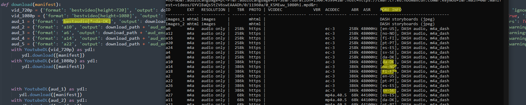 i have two different mpd's one of them i can use {'format': 'bestaudio[format_id*=dan]', because the id is labeled with