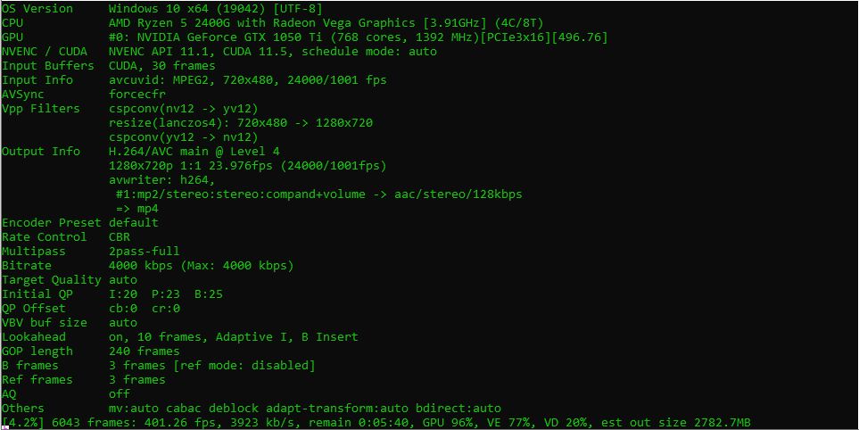 Code:nvencc64 --avhw -i "%%~na.mpg" --avsync forcecfr --fps 23.976 --profile main --level 4 --dar 16:9 --multipass 2pass-full --cbr 4000K --codec h264 --lookahead 10 --audio-codec aac --audio-stream :stereo --audio-filter "compand=.3|.3:1|1:-90/-60|-60/-40|-40/-30|-20/-20:6:0:-90:0.2,volume=3" --audio-bitrate 128 --vpp-resize lanczos4 --output-res 1280:720 -o "%%~na (720).mp4"