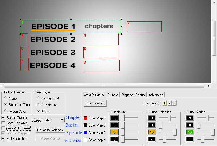 I write all the texts in Photoshop and only draw rectangles in my authoring app (plus all the subpic related stuff explained above). The actual overlapping of the rectangles was archived in PgcEdit.