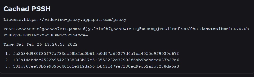 I received such a PSSH: AAAAXHBzc2gAAAAA7e+LqXnWSs6jyCfc1R0h7QAAADwIARIQ5W UHOHpjTRO11McfYeO/0hoIdXNwLWNlbmMiGDVXVUhPSHBqVFJPMTFNY2ZZZU8vMGc9PS oAMgA=