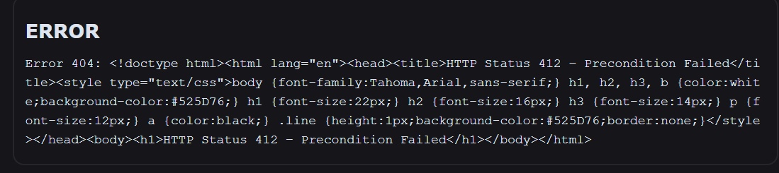 Error 404: <!doctype html><html lang="ru"><head><title>HTTP Status 412 – Precondition Failed</title><style type="text/css">body {font-family:Tahoma,Arial,sans-serif;} h1, h2, h3, b {color:white;background-color:#525D76;} h1 {font-size:22px;} h2 {font-size:16px;} h3 {font-size:14px;} p {font-size:12px;} a {color:black;} .line {height:1px;background-color:#525D76;border:none;}</style></head><body><h1>HTTP Status 412 – Precondition Failed</h1></body></html> -
