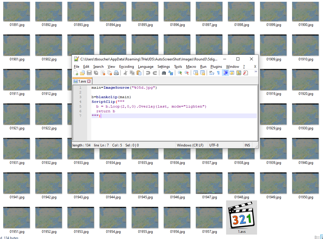 Code:ImageSource("C:\Users\tboucher\AppData\Roaming\THeUDS\AutoScreenShot\Images\Round3\5digit\%05d.jpg", start=00001, end=01957, fps=30) -