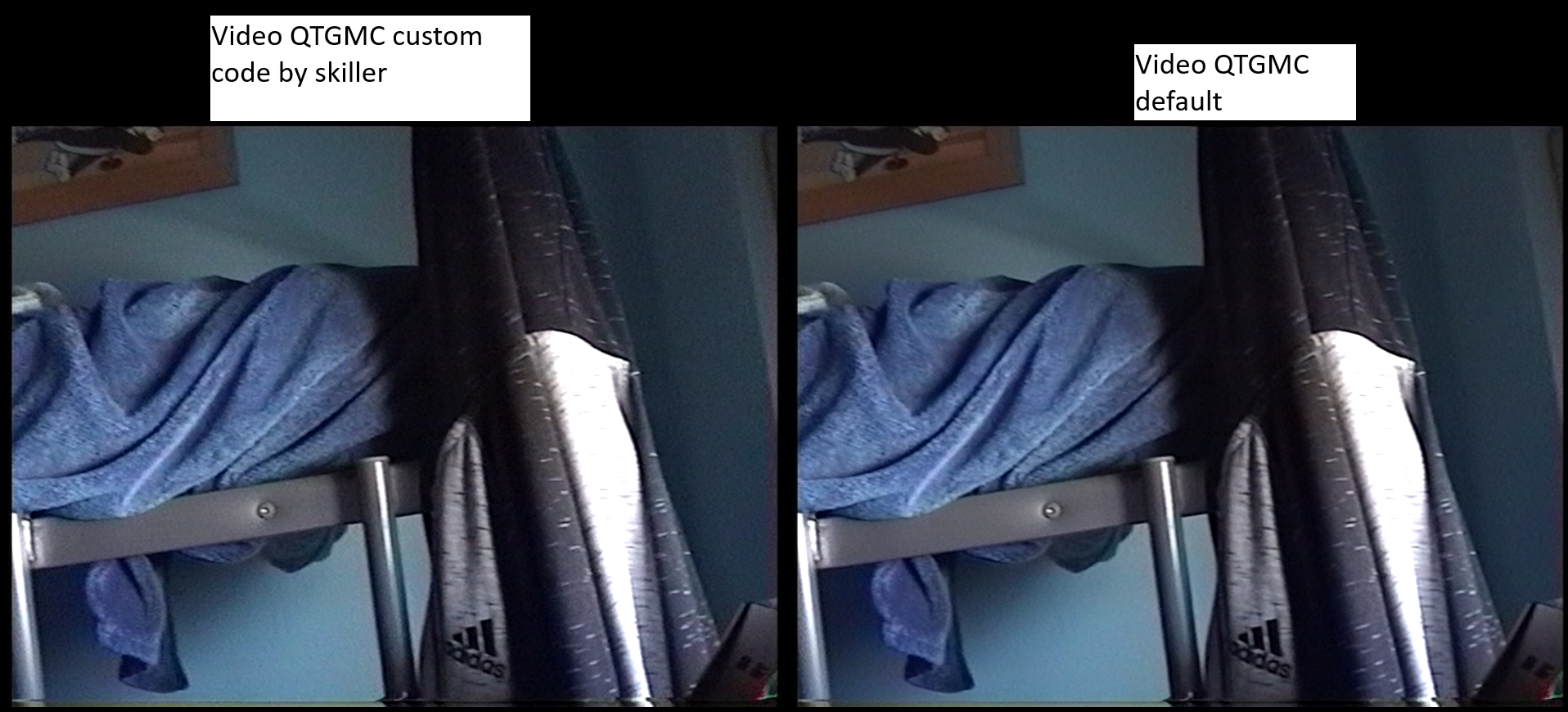 You can run your typical workflow with QTGMC and use StackHorizontal() in AVS. I think of creating left-right old-new versions encode but I think users like to see full-screen run of a moving pictures sample and to estimate overal quality. The same is for industry experts quality evaluation - no side by side or frame interleaved comparisons (?). I tried to compare also with realtime hardware deinterlacing via NVIDIA Pascal-series card (via MPC_HC) - it looks much less detailed. But I think still some sharpnener is active in QTGMC with slow preset by default (?). -