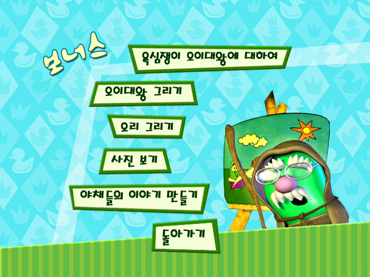 These two are the "Features" menus for two different editions of VeggieTales: King George and the Ducky. The English one is from my American DVD of it, while the Korean one is from my Korean DVD of it.