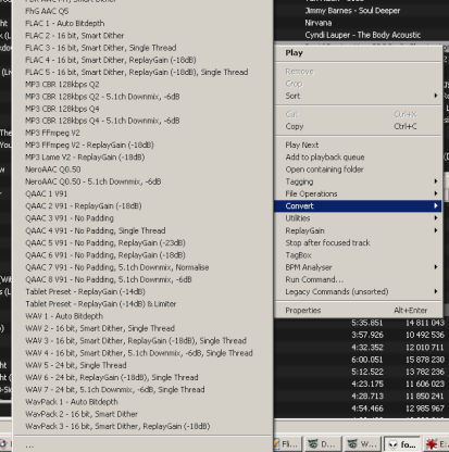 There's a bunch of conversion presets ready to use, and you can modify them or you can create your own. Some of them downmix multichannel audio to stereo before it's re-encoded, or use ReplayGain to adjust the volume amongst other things. Selecting the Convert menu will bring up a list of conversion presets similar to this one. Selecting a preset will convert using that preset.