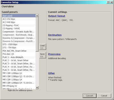 I should update it at some stage as it's an older version now but it'll still work fine. As well as being a great audio player, foobar2000 is also a very useful audio converter. The portable version I linked to is still very similar to my current setup. It'll convert just about any audio format to any audio format, and you can add DSPs to the conversion chain. The only thing not included in the zip file is ffmpeg. It's needed to decode/encode some formats. There's a text file included with instructions for where to put ffmpeg and a few other things.