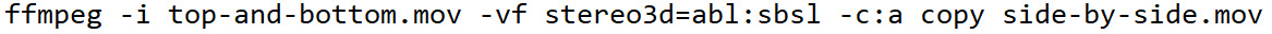 I have a VIZIO 501d-A2R 3D TV and I need to convert an mp4 file that is top-bottom (1920x2160) to a SBS, to the best resolution possible of course (I don't care if it's a slow conversion). I have somewhat familiar with Handbrake, Cyberlink Power Director and on occasion ffmpeg. I could get access to a computer that has Adobe Premiere but I've not used it before. I don't really know what I'm doing, I'm just looking for the best result. Just FYI I will be streaming this to my TV via DLNA through my Roku device.