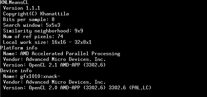 Same issue, unfortunately. I tried the modded version and it did appear to be an improvement, but luma is still all messed up. So it must be something specific to my setup like you said. I was able to successfully run a few OpenCL benchmarks, the first few using something called GeekBench. Scores rated fairly well, but I wasn't able to see any "visual" feedback on screen.What about using 8bit, YUV420P8 to feed into KNLMeans