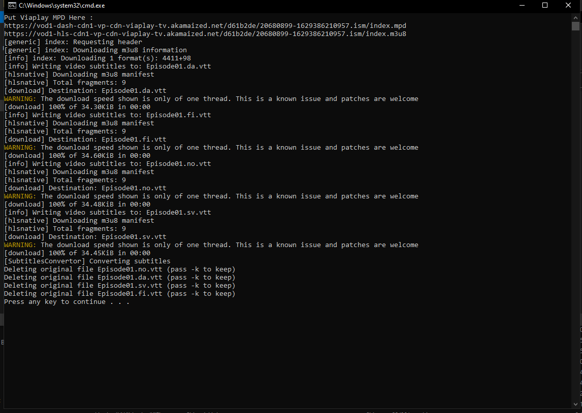 Code:C:\Ffmpeg>yt-dlp --write-subs --skip-download "https://viaplay.se/player/default/film/words-on-bathroom-walls-2020" [generic] words-on-bathroom-walls-2020: Requesting header WARNING: [generic] Falling back on generic information extractor. [generic] words-on-bathroom-walls-2020: Downloading webpage [generic] words-on-bathroom-walls-2020: Extracting information ERROR: Unsupported URL: https://viaplay.se/player/default/film/words-on-bathroom-walls-2020 C:\Ffmpeg>yt-dlp --write-subs --skip-download "https://vod20-dash-cdn1-vp-cdn-viaplay-tv.akamaized.net/d3c72e9/20662139-1614612860501.ism/index.mpd?filter=%28FourCC%3D%3D%22AVC1%22%26%26systemBitrate%3C5200000%26%26systemBitrate%3E200000%26%26framerate%3C60%26%26maxHeight%3C721%29%7C%7C%28type%3D%3D%22audio%22%26%26%28FourCC%3D%3D%22AACL%22%29%29%7C%7C%28type%3D%3D%22textstream%22%26%26%28systemLanguage%3D%3D%22isl%22%7C%7CsystemLanguage%3D%3D%22ice%22%7C%7CsystemLanguage%3D%3D%22fin%22%7C%7CsystemLanguage%3D%3D%22swe%22%7C%7CsystemLanguage%3D%3D%22dan%22%7C%7CsystemLanguage%3D%3D%22nor%22%29%29" [generic] index: Requesting header WARNING: [generic] Falling back on generic information extractor. [generic] index: Downloading webpage [generic] index: Extracting information ERROR: [generic] index: This video is DRM protected C:\Ffmpeg>yt-dlp --allow-u --write-subs --skip-download "https://vod20-dash-cdn1-vp-cdn-viaplay-tv.akamaized.net/d3c72e9/20662139-1614612860501.ism/index.mpd?filter=%28FourCC%3D%3D%22AVC1%22%26%26systemBitrate%3C5200000%26%26systemBitrate%3E200000%26%26framerate%3C60%26%26maxHeight%3C721%29%7C%7C%28type%3D%3D%22audio%22%26%26%28FourCC%3D%3D%22AACL%22%29%29%7C%7C%28type%3D%3D%22textstream%22%26%26%28systemLanguage%3D%3D%22isl%22%7C%7CsystemLanguage%3D%3D%22ice%22%7C%7CsystemLanguage%3D%3D%22fin%22%7C%7CsystemLanguage%3D%3D%22swe%22%7C%7CsystemLanguage%3D%3D%22dan%22%7C%7CsystemLanguage%3D%3D%22nor%22%29%29" WARNING: You have asked for UNPLAYABLE formats to be listed/downloaded. This is a developer option intended for debugging. If you experience any issues while using this option, DO NOT open a bug report [generic] index: Requesting header WARNING: [generic] Falling back on generic information extractor. [generic] index: Downloading webpage [generic] index: Extracting information [info] index: Downloading 1 format(s): video=2496356+audio_eng_2=96000 [info] Writing video subtitles to: index [index].da.vtt ERROR: Unable to download video subtitles for 'da': HTTP Error 403: Forbidden -