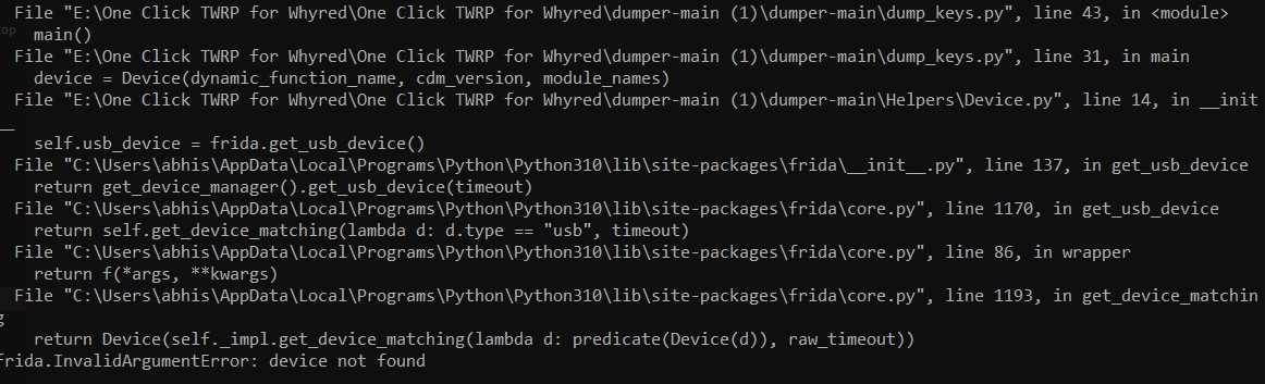 23. I think I reduced the version to the one shown in example did crash my phone but then I had incompatible error in dump_keys so I reduced the version of frida-tools in my pc pip install frida-tools = 10.0.0 something close to the version of frida installed on my phone and it worked. I was able to dump it. Thanks!