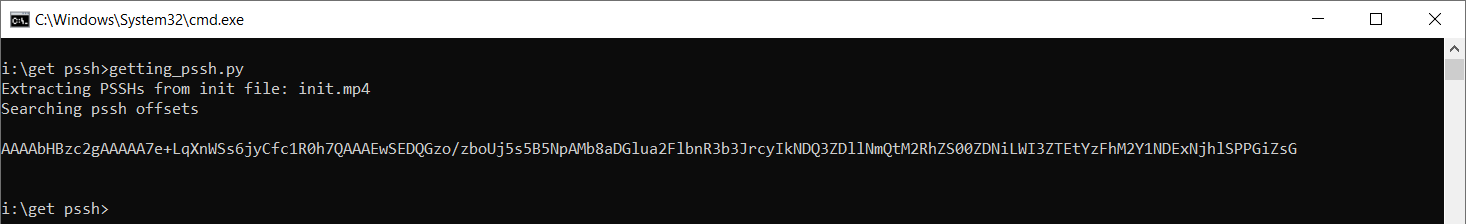 Code:import base64 from pathlib import Path def find_wv_pssh_offsets(raw: bytes) -> list: print('Searching pssh offsets') offsets = [] offset = 0 while True: offset = raw.find(b'pssh', offset) if offset == -1: break size = int.from_bytes(raw[offset-4:offset], byteorder='big') pssh_offset = offset - 4 offsets.append(raw[pssh_offset:pssh_offset+size]) offset += size return offsets def to_pssh(content: bytes) -> list: wv_offsets = find_wv_pssh_offsets(content) return [base64.b64encode(wv_offset).decode() for wv_offset in wv_offsets] def from_file(file_path: str) -> list: print('Extracting PSSHs from init file:', file_path) return to_pssh(Path(file_path).read_bytes()) pssh_list = from_file('init.mp4') target_pssh = None for pssh in pssh_list: if 70 < len(pssh) < 190: target_pssh = pssh print(f'\n{target_pssh}\n') print(target_pssh, file=open("pssh.txt", "w"))