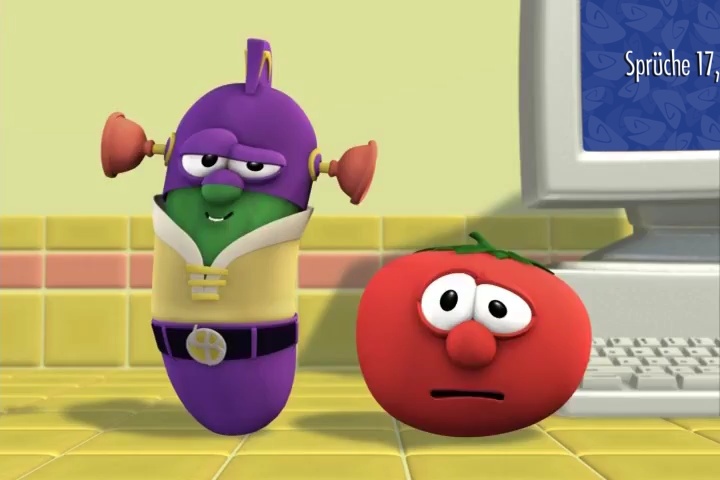 Now, as I've stated in a previous thread, me and a few friends are planning on doing a series of German fandubs of scenes that were cut from the German dubs of some VeggieTales episodes. I will be having the Bible verses that Qwerty shows in the closing countertops localized. However I feel like I can't do this myself. I think I'm really gonna need help. I have made the verses unbulged, though. The first episode we will be dubbing the scenes that were cut from for is Sheerluck Holmes and the Golden Ruler. Here's the German verse I've made:
