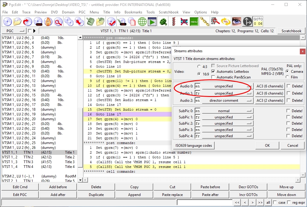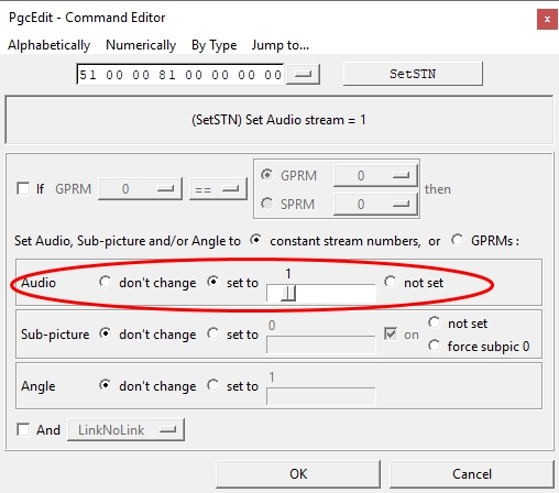 Since you want audio stream 1 (French) to be the default at all times, you can just add a new command line of (SetSTN) Set Audio stream = 1 as the very first line in the pre-commands section of all four titles (yes, it needs to be done for each). Change all the other original SetSTN commands into NOPs.Last edited by Skiller; 3rd Dec 2022 at 20:10.
