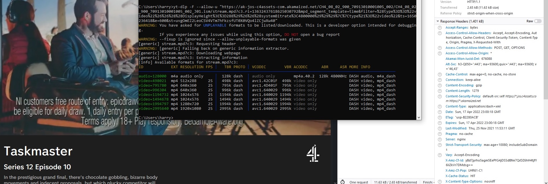 Now I only need to figure out why... Could be a limitation imposed on the user account I'm using.Code:https://ak-jos-c4assets-com.akamaized.net/CH4_43_02_900_70914001001002_001/CH4_43_02_900_70914001001002_001_J01.ism/stream.mpd?c3.ri=13505210914841619937&mpd_segment_template=time&filter=(type=="video"&&((DisplayHeight>=288)&&(DisplayHeight<=576)))||type!="video"&ts=1650237886&e=600&st=ogfRm2mgvM_yxzaYgsXEJUz0Yluvf799U7N8mG6yV1E