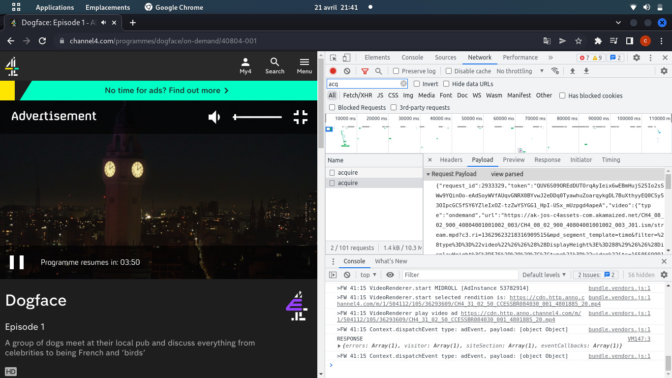 doesn't show anything. I'm using chrome and when I open dev tools and search for 'acquire' in the console tab it is empty.Code:In your browser, open dev tools... play the video... filter 'acquire' to find the POST licence call... check the payload (all the info in blue is there)