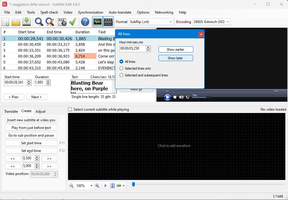 Then use (Synchronization, Adjust all times, all lines, show later) with 5.529 seconds to bring it to the desired start time of 33.800.