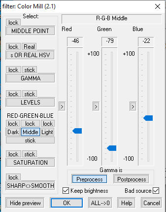 Using Virtualdub + Color Mill (2.1) filter just did the trick. Maybe close enough.