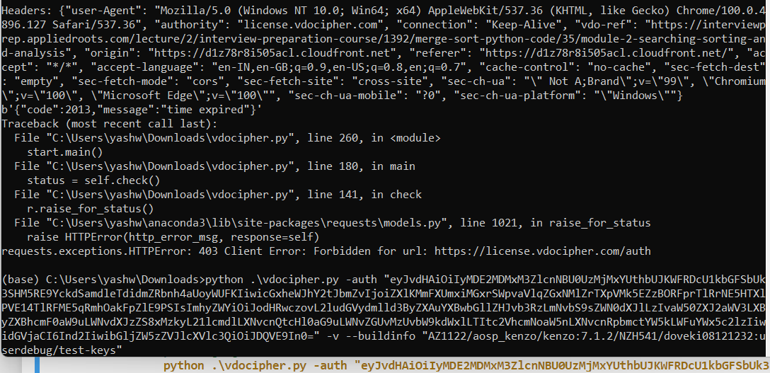 python .\vdocipher.py -auth "eyJvdHAiOiIyMDE2MDMxM3ZlcnNVU0UzMjNlU0RtWFF6bXZNc 0x3azloMHh6cWR0d3lsUTYzRkZpb3VwTmFJQ2tZWEJGSDNXIiw icGxheWJhY2tJbmZvIjoiZXlKMmFXUmxiMGxrSWpvaU16Um1NV EEzTWpVMk16RTFOR0V4WWpsaVlXWTROelkwTjJGaFpqWTFPV0l pZlE9PSIsImhyZWYiOiJodHRwczovL3B5dGhvbnNjcmlwdHMuY XBwL3Byb3ZhLXZpZGVvLyIsInRlY2giOiJ3diIsImxpY2Vuc2V SZXF1ZXN0IjoiQ0FRPSJ9" -v --buildinfo "AZ1122/aosp_kenzo/kenzo:7.1.2/NZH541/doveki08121232:userdebug/test-keys"